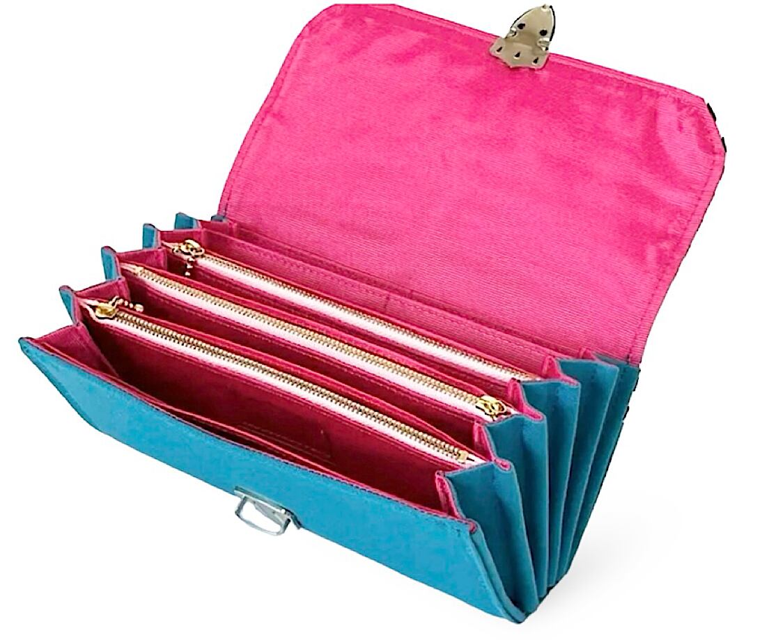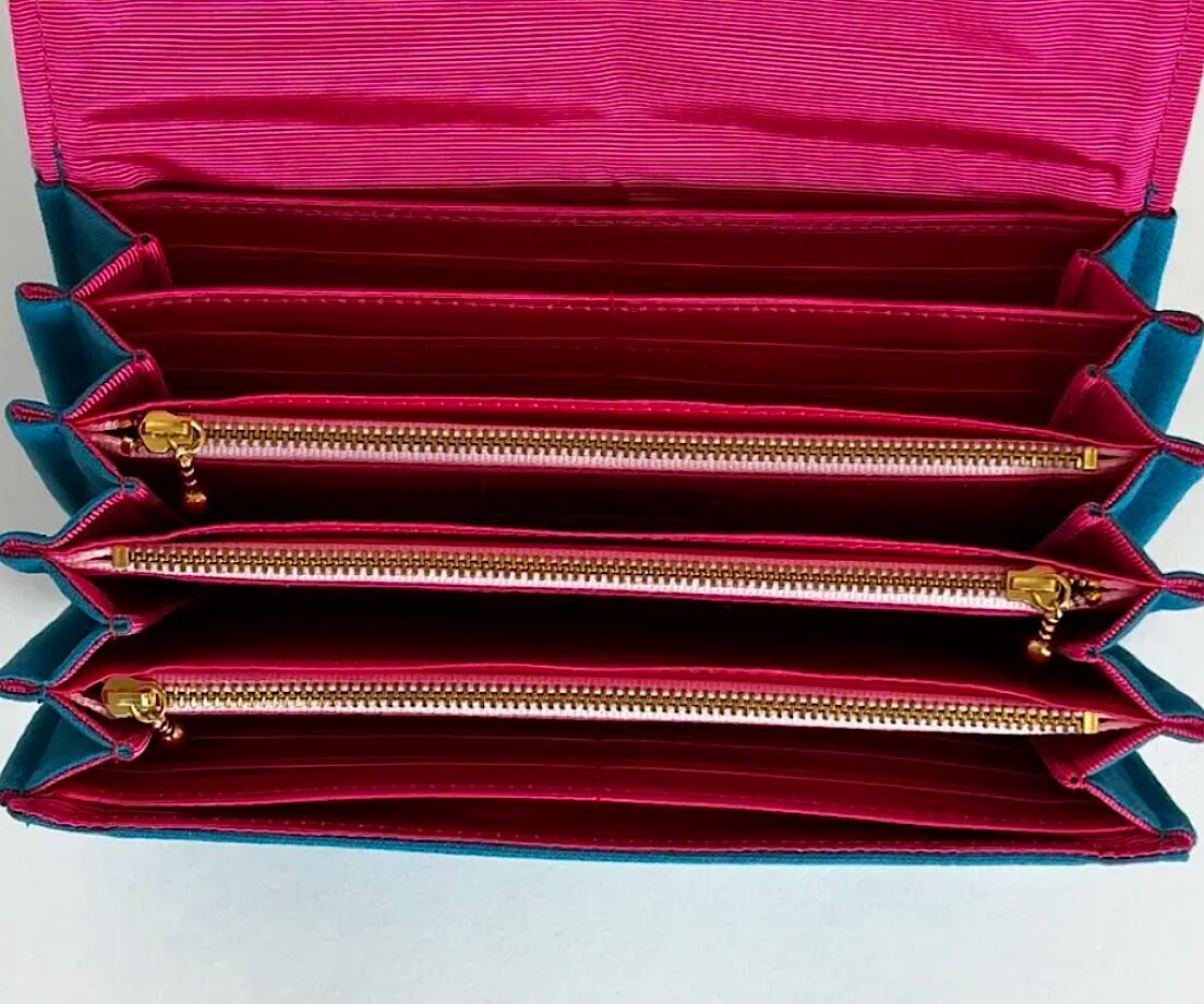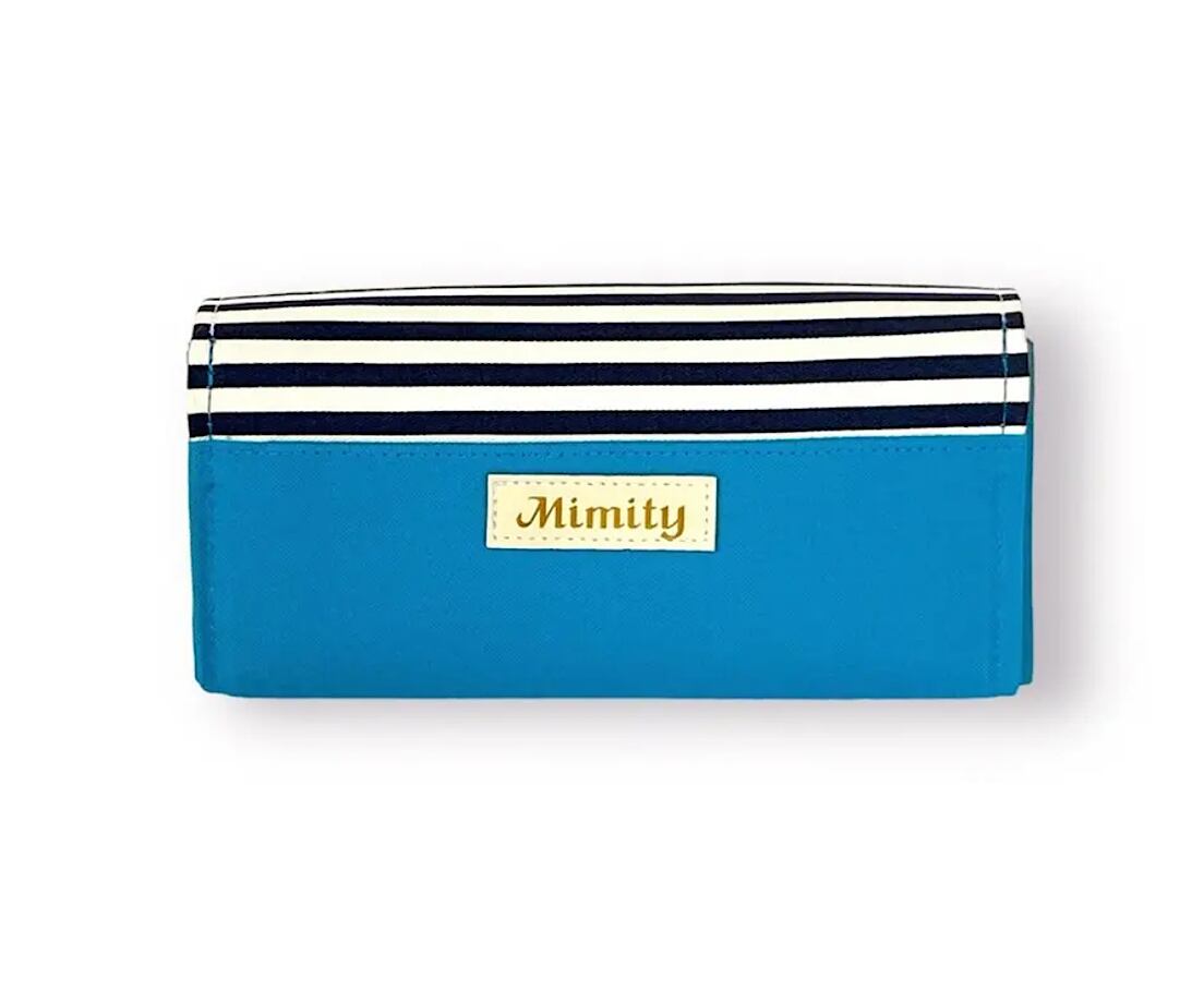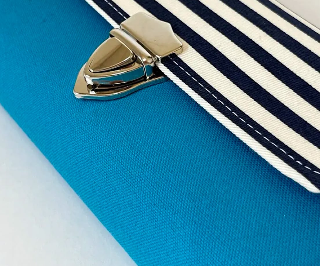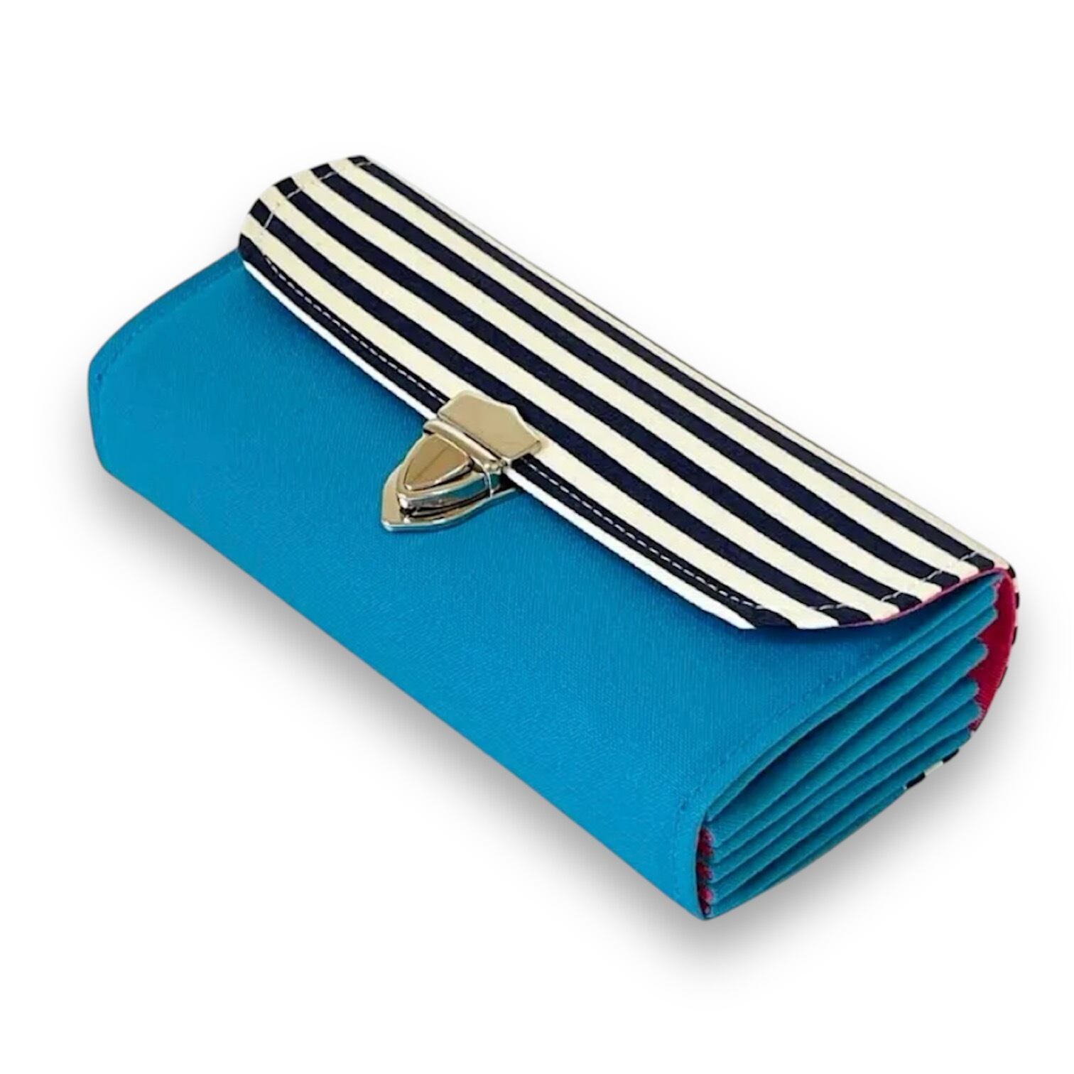 ターコイズブルーの帆布生地とボーダー柄のツイル生地を使って家計やりくり財布を製作しました!