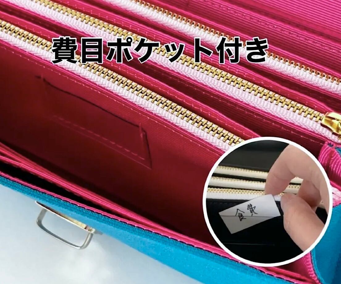 また、ファスナーポケットにはクリアポケットを付けていますので費目を書いた紙を入れられるようになっています。