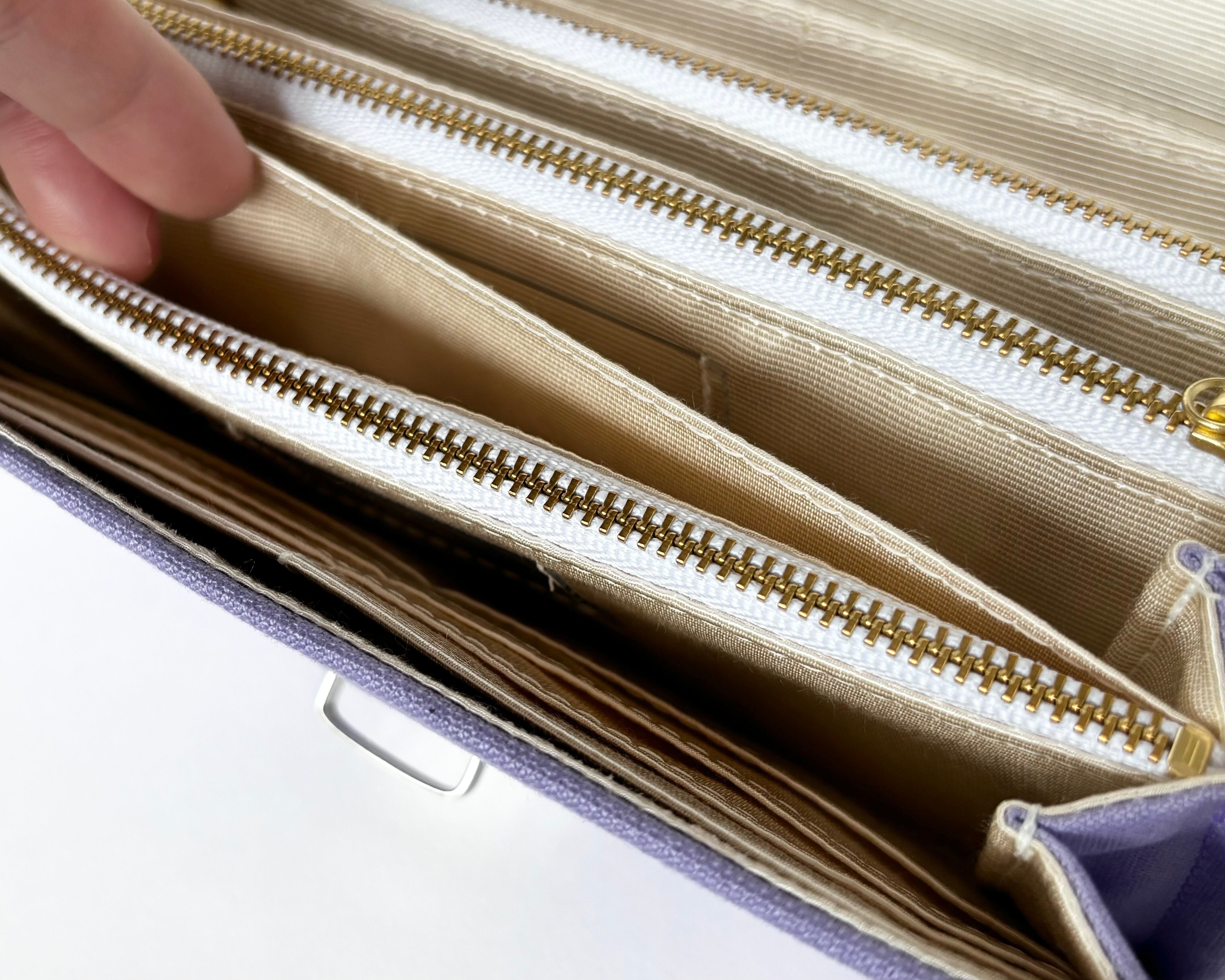 また、ファスナーポケットにはクリアポケットを付けていますので費目を書いた紙を入れられるようになっています。