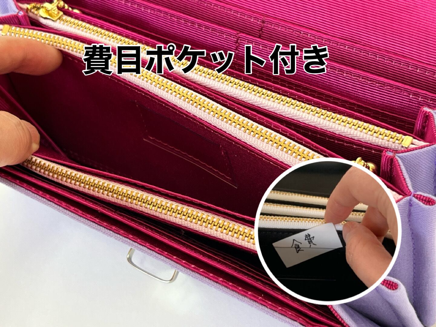 また、ファスナーポケットにはクリアポケットを付けていますので費目を書いた紙を入れられるようになっています。