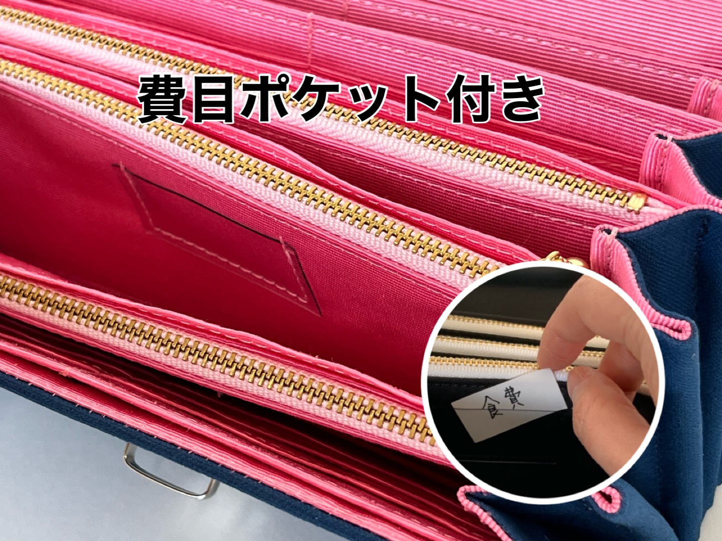 また、ファスナーポケットにはクリアポケットを付けていますので費目を書いた紙を入れられるようになっています。